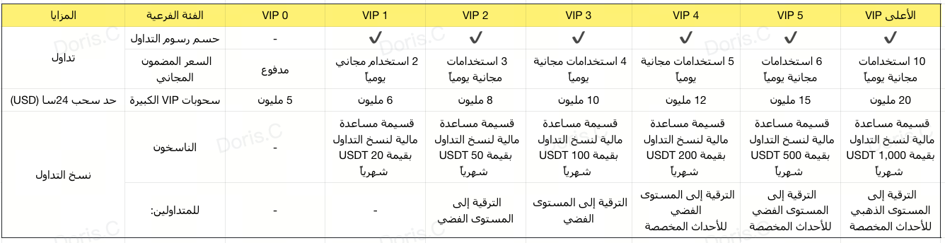 - حد السحب خلال 24 ساعة (USD): لدعم احتياجاتك من تدفق رأس المال، يزداد حد السحب خلال 24 ساعة (بعملة USD) مع مستوى VIP، مما يوفر مرونة أكبر.