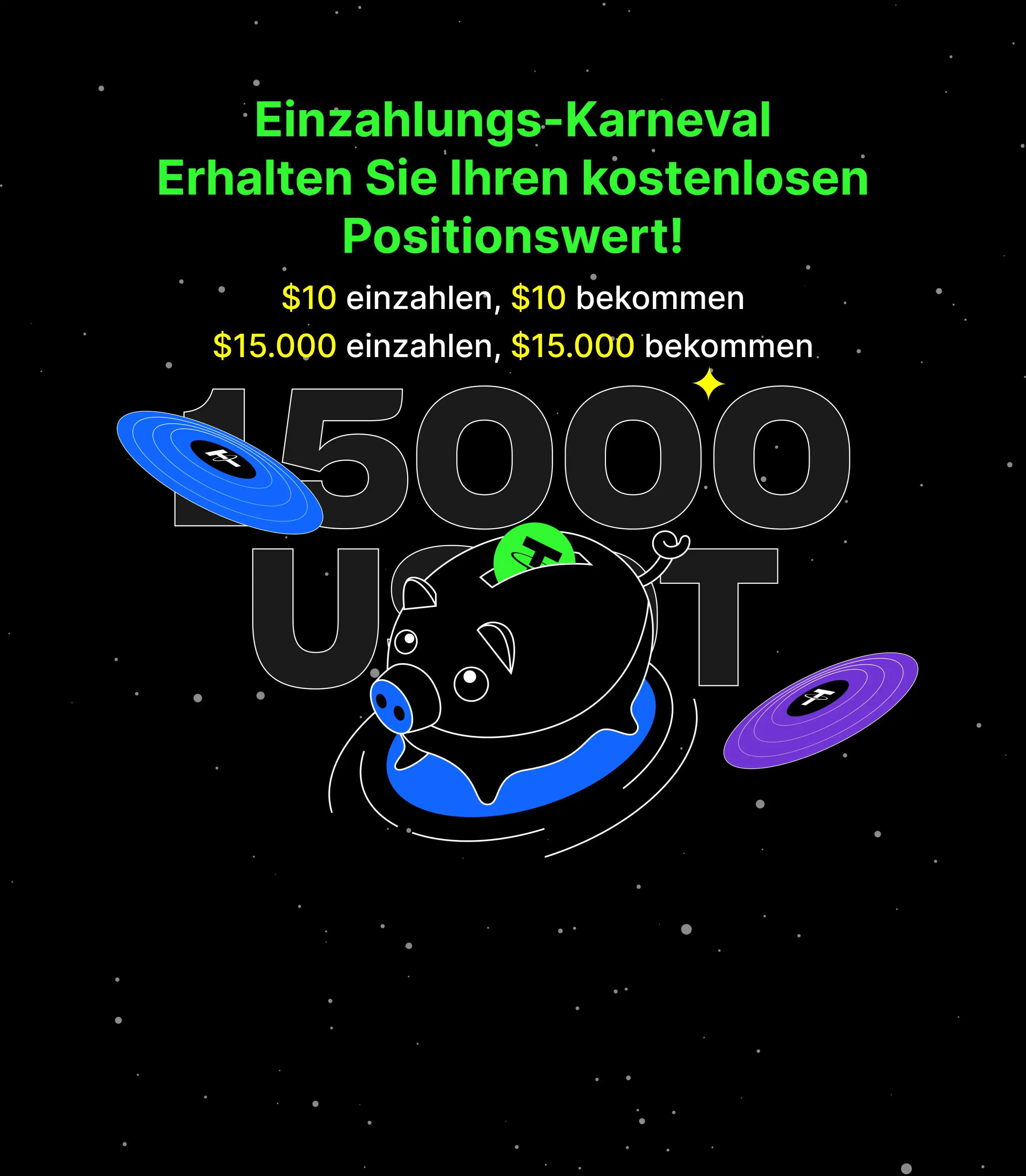5 Bonuswert = Futures-Positionswert = Bonus-Nennwert x Hebelwirkung. Nutzer, die während des Event-Zeitraums eine Nettoeinzahlung von $15.000 haben, erhalten eine Belohnung mit einem Futures-Positionswert von bis zu $15.000.