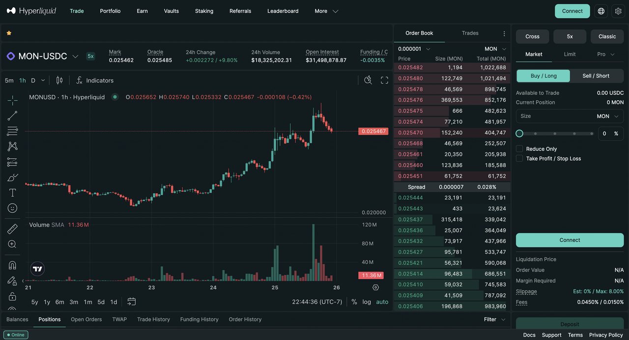 - Perdagangan Futures Perpetual: Order book sepenuhnya on-chain dengan leverage tinggi, likuiditas dalam pada pasangan utama, dan eksekusi cepat.