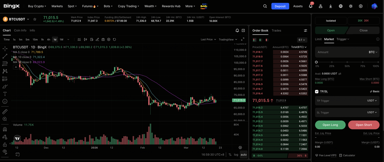 BingXはユーザーにビットコインへの露出を得る複数の方法を提供します。オプションには、直接的なBTC所有のための現物取引と、レバレッジロングまたはショートポジションのためのUSDT決済無期限先物が含まれます。利用可能性は地域と規制要件によって異なります。