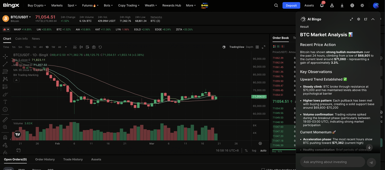 - 現物取引でBTC/USDTを検索し市場状況を評価:現物市場に行き、BTC/USDTを検索し、リアルタイム価格、取引板の厚み、最近の取引活動を確認します。注文を出す前に、最近の価格トレンドや主要な技術レベルについてBingX AIに尋ねることもできます。