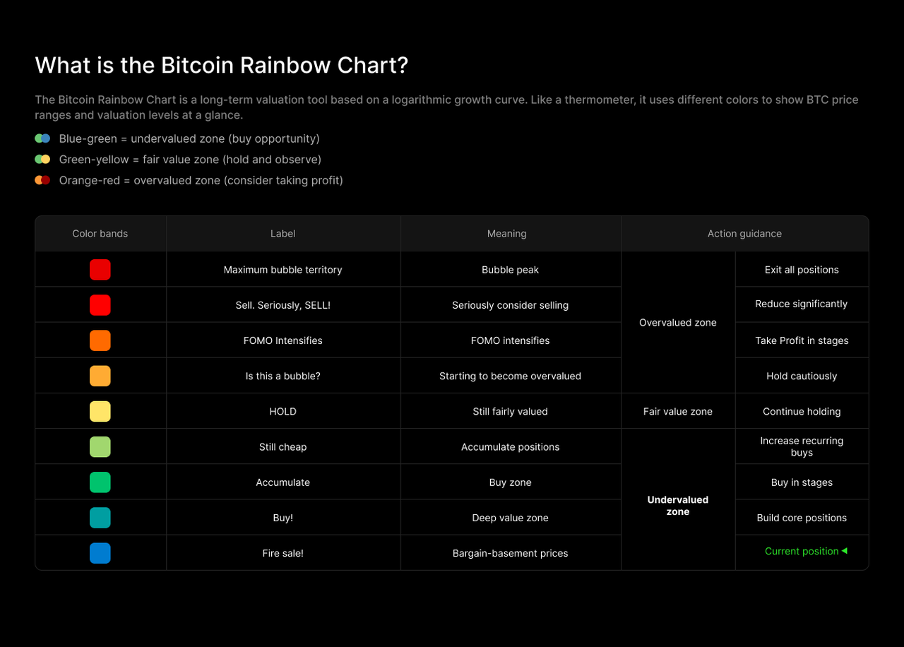 まとめると、このフレームワークはビットコインの長期サイクル内での位置を解釈する明確な方法を提供しており、そのためレインボーチャートは長期価値を評価するために最も広く参照されるツールの一つとして残っています。