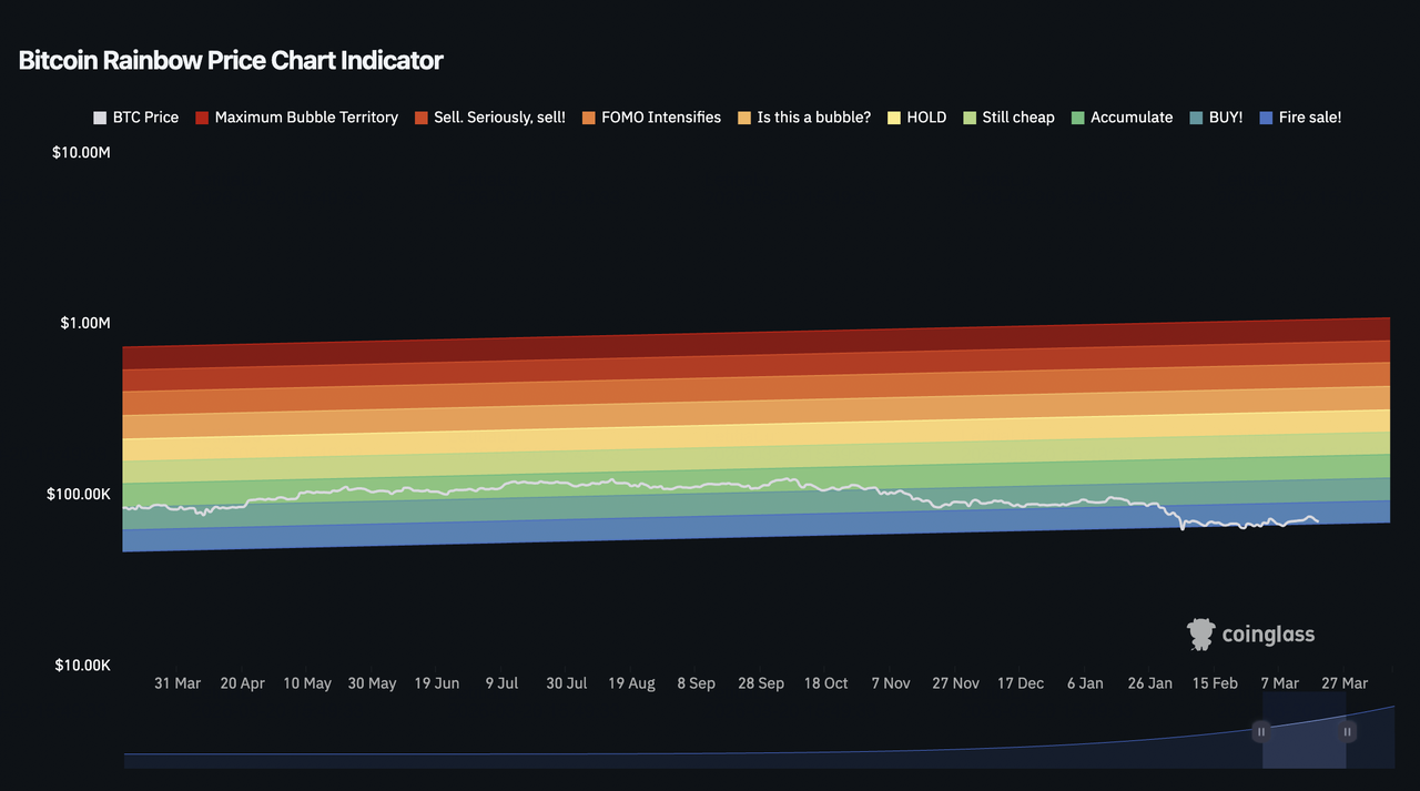 ビットコインレインボーチャートは現在、BTCを「ファイヤーセール」バンド、モデルによって特定された最低かつ最も過小評価されたゾーンに位置付けています。このレベルは、ビットコインの完全な市場履歴を通じて、わずか6回しか現れておらず、現在の読み取り値を比較的稀なシグナルにしています。