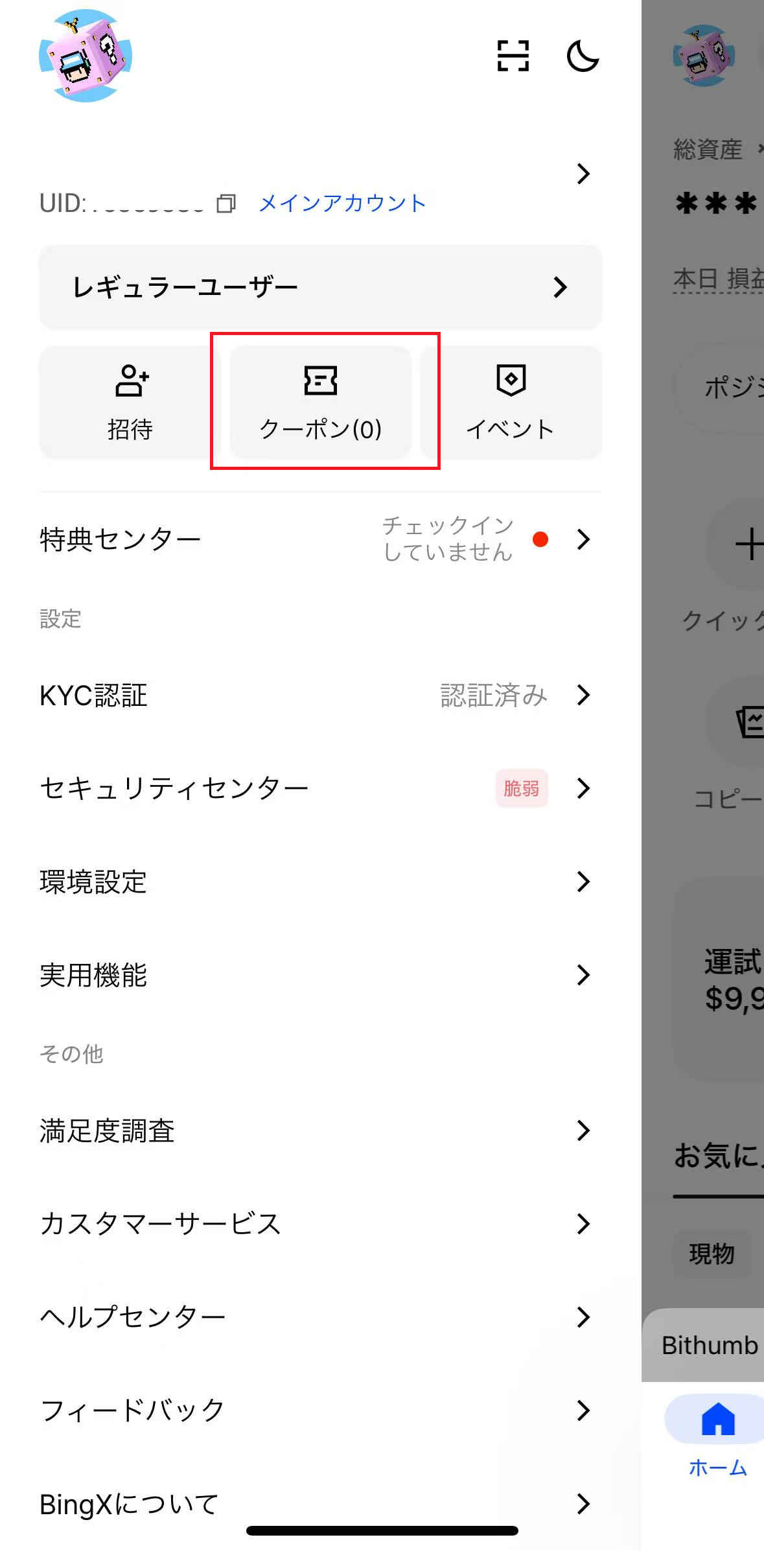 ステップ 1: BingXアプリの場合:アイコンをタップ → 「クーポン」。BingXウェブの場合:画面上部のナビゲーションバーにあるプロフィールアイコンをクリック → 「クーポン券」 。