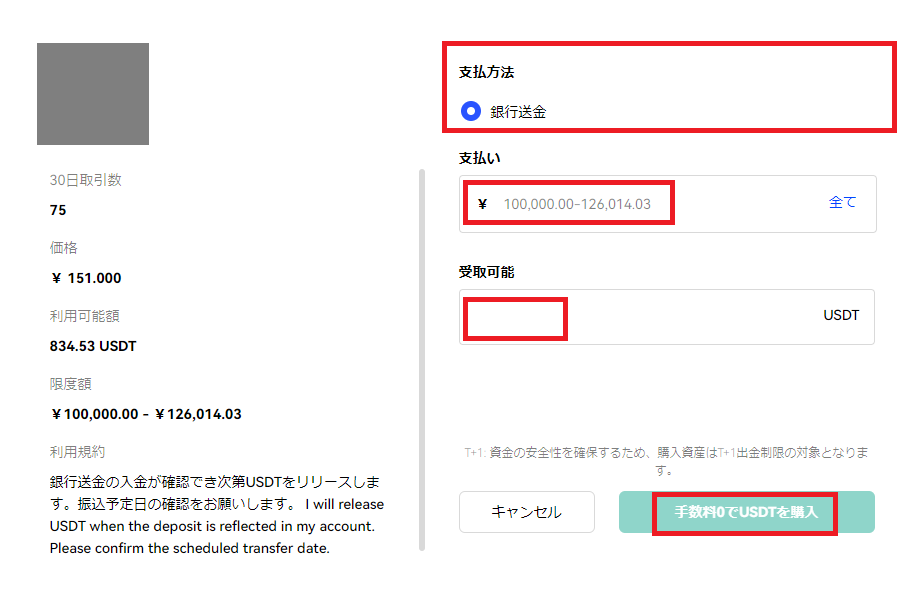 ステップ2:支払い通貨を選択し、数量を入力して"検索"をクリックします。表示された検索結果から販売者を選択し、"USDT購入"をクリックします。