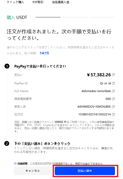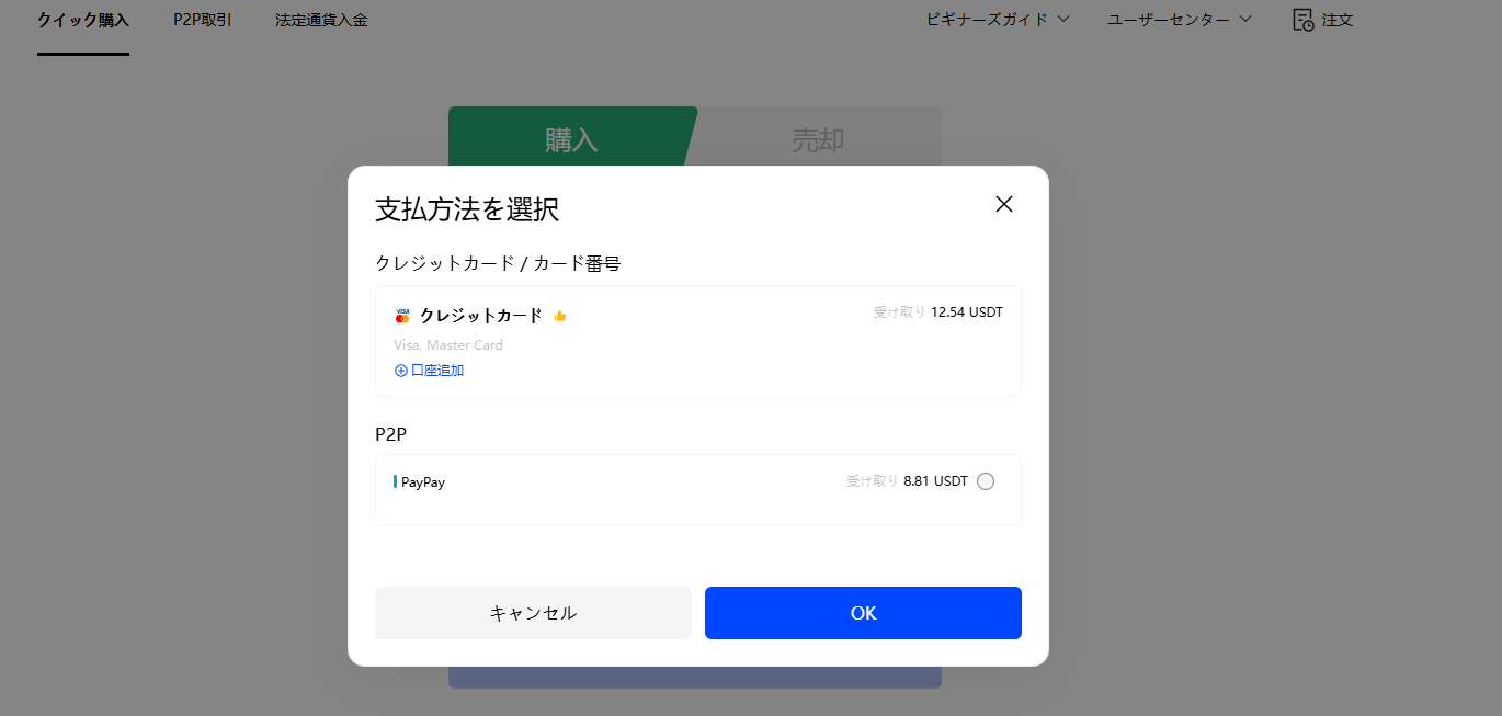 - P2P取引を選択された場合は、前述のP2Pマーチャントの購入手順に従ってください。