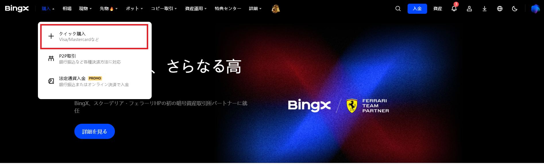 BingXは現在、法定通貨から暗号資産の取引に3つの方法を提供しています: P2P取引、クイック購入、法定通貨入金です。本チュートリアルでは、BingX公式ウェブサイトでの暗号購入方法をご紹介します。