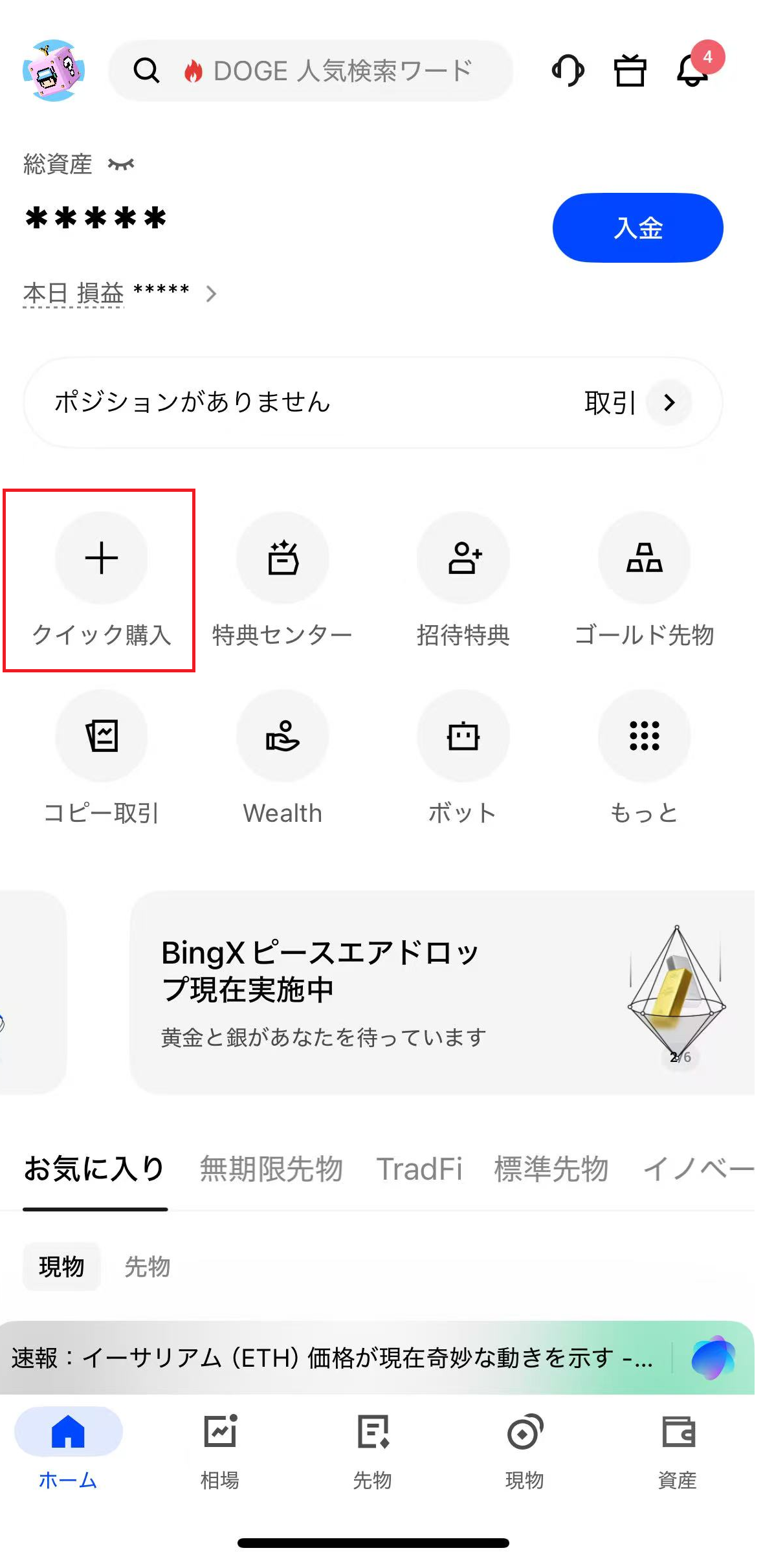 BingXの公式ウェブサイトにアクセスして、アカウントを作成する、または既存のアカウントにログインします。ページの「暗号資産購入」-「クイック購入」をクリックしてください。
