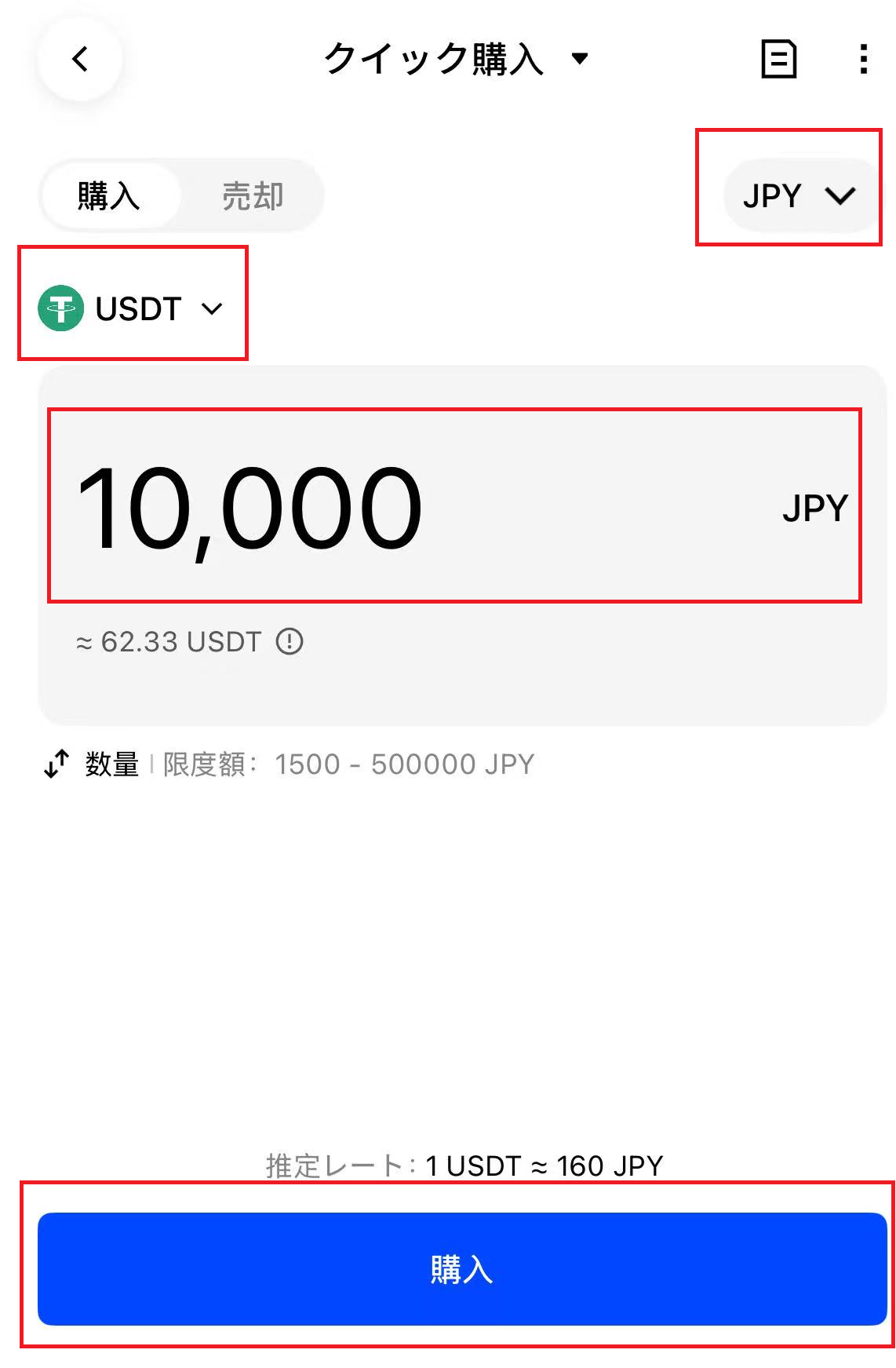 支払いに使用する法定通貨と購入をご希望の暗号資産を選択します。支払金額または購入したい暗号資産の数量を入力し、「購入」をクリックします。