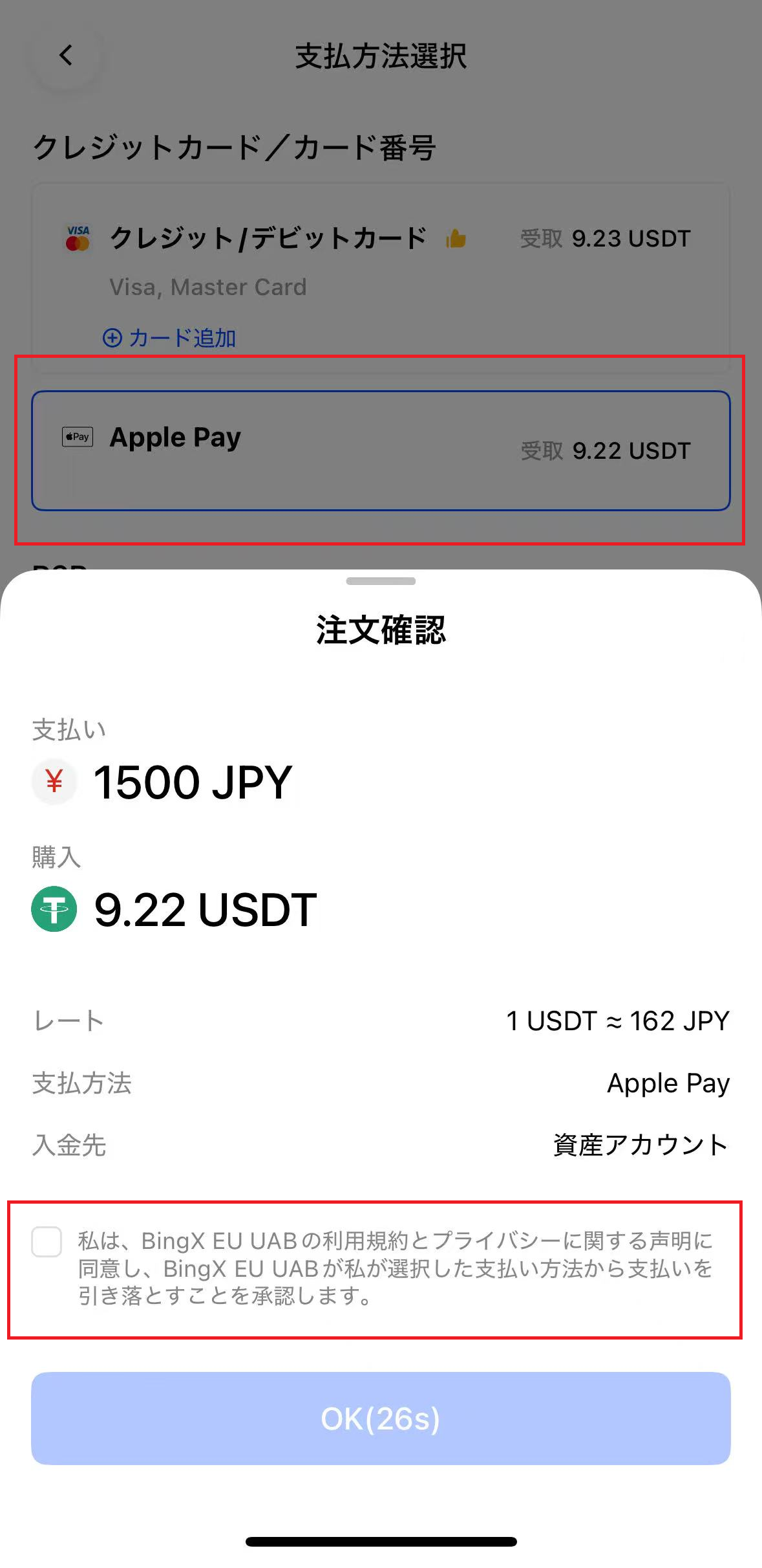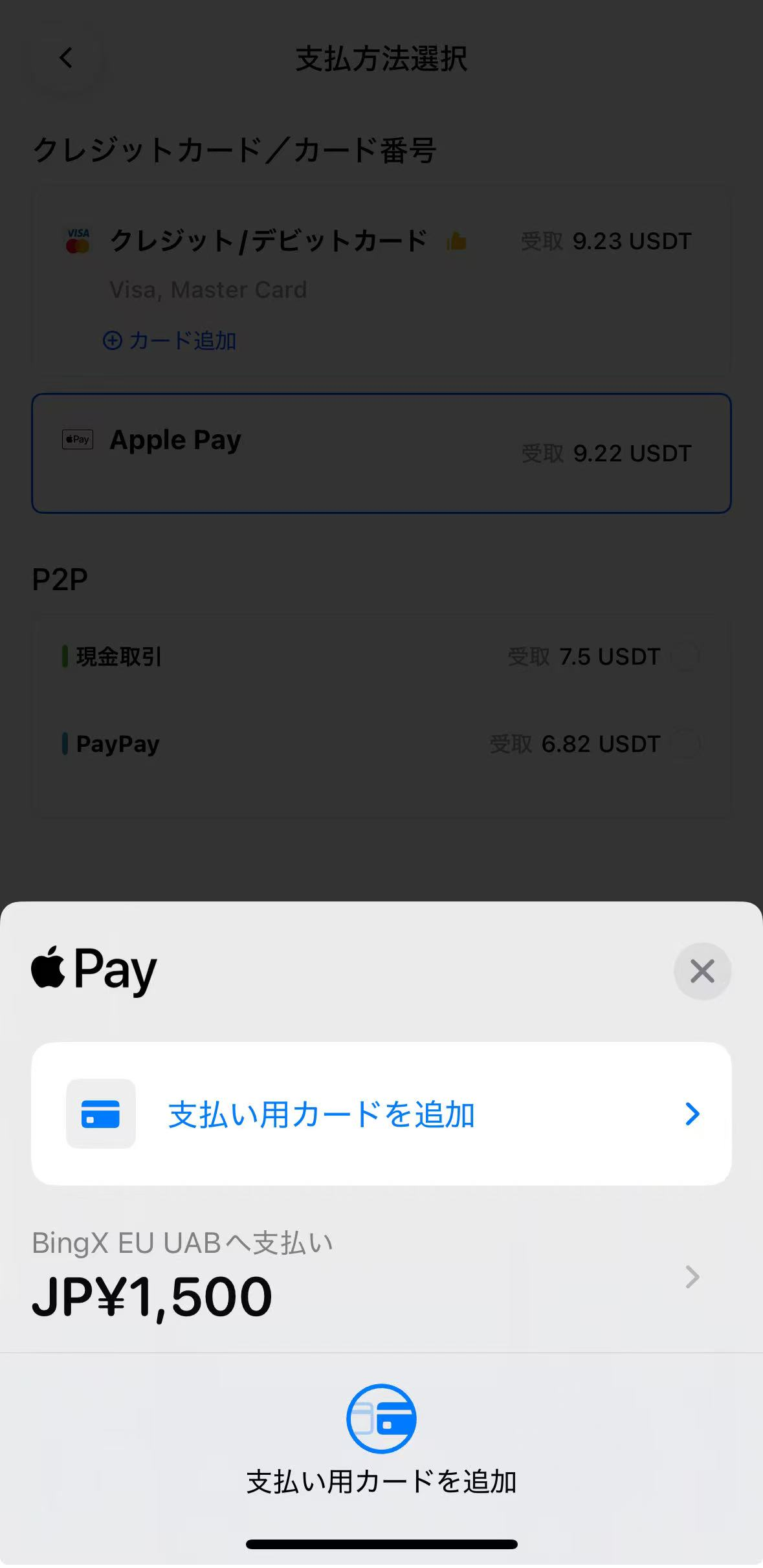 支払いが完了すると、ネットワークの処理時間によって、暗号資産がBingXアカウントに反映されるまで数分かかることがあります。取引の詳細はApple Payでご確認ください。