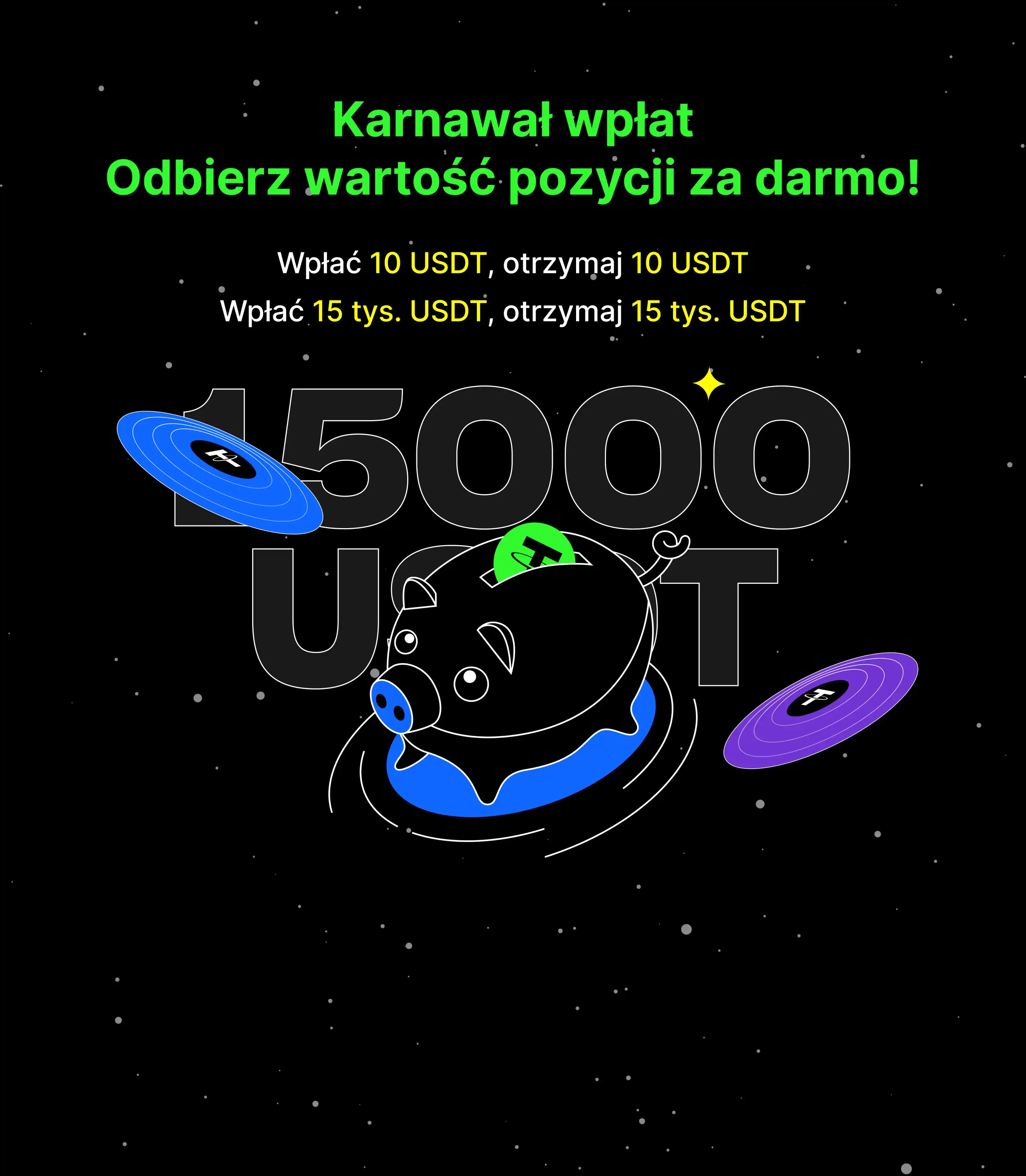 5 Wartość bonusu = wartość pozycji futures = wartość nominalna bonusu * dźwignia. Użytkownicy, którzy dokonają wpłaty netto w wysokości 15 tys. USDT podczas wydarzenia, otrzymają nagrodę o wartości pozycji futures do 15 tys. USDT.