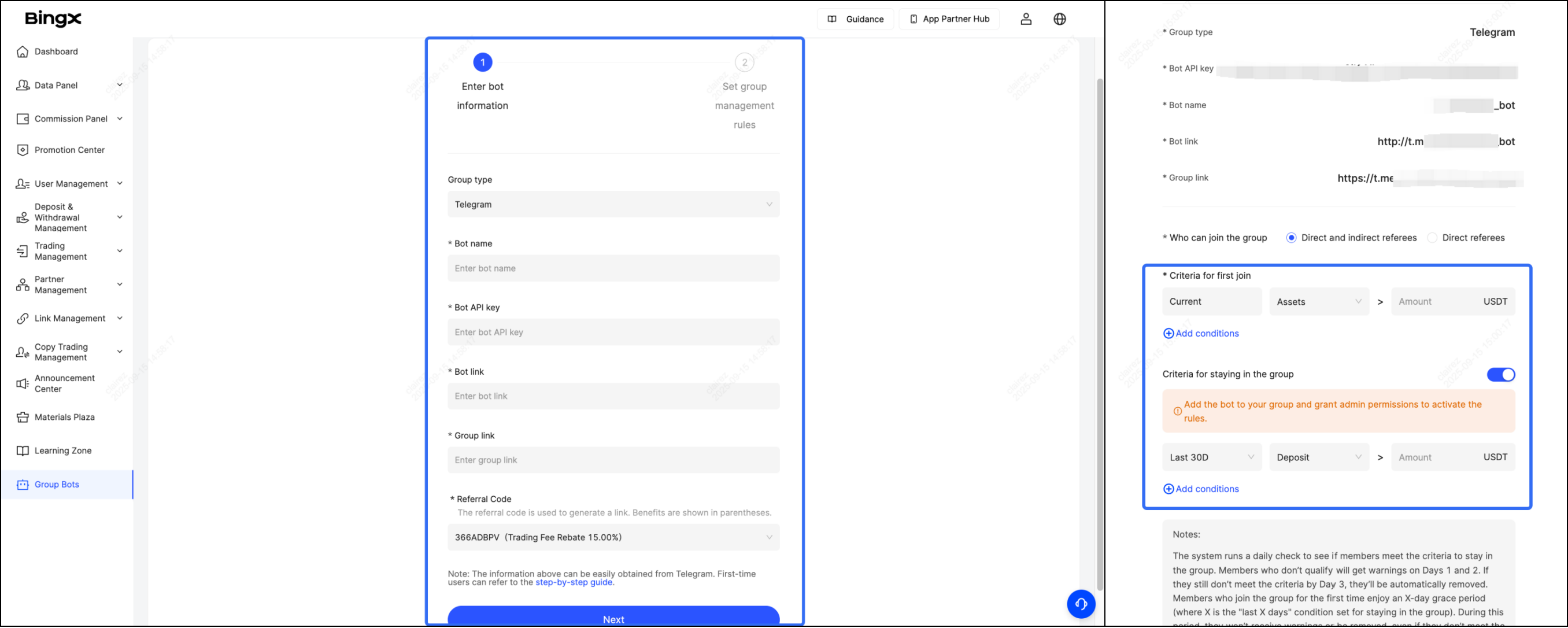 6. Otwórz stronę internetową BingX, przejdź do Centrum partnera - Boty grupy, aby utworzyć nowego bota. Wypełnij powyższe dane, ustaw kryteria pierwszego dołączenia i pozostania w grupie. Twój bot jest gotowy.
