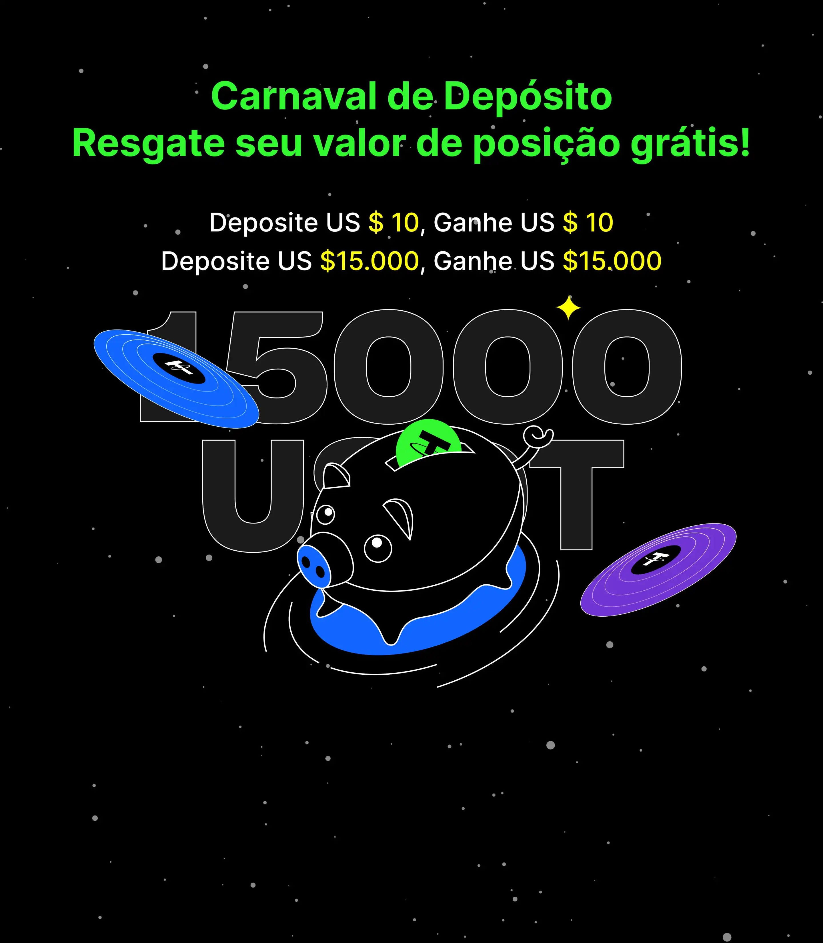 5 Valor do bônus = Valor da posição em futuros = Valor nominal do bônus x alavancagem. Usuários que tiverem um depósito líquido de US$ 15.000 durante o período do evento receberão uma recompensa com valor de posição em futuros de até US$ 15.000.