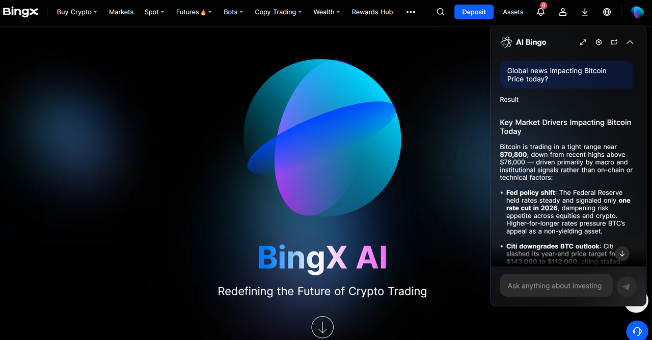 Instrumentul BingX: În loc să urmărești manual fiecare raport, BingX AI Macro-Pulse (AI Bingo) analizează știrile globale, acțiunile băncilor centrale și fluxurile on-chain în timp real, alertându-te când condițiile predominante ale pieței se schimbă de la Lăcomie la Frică.