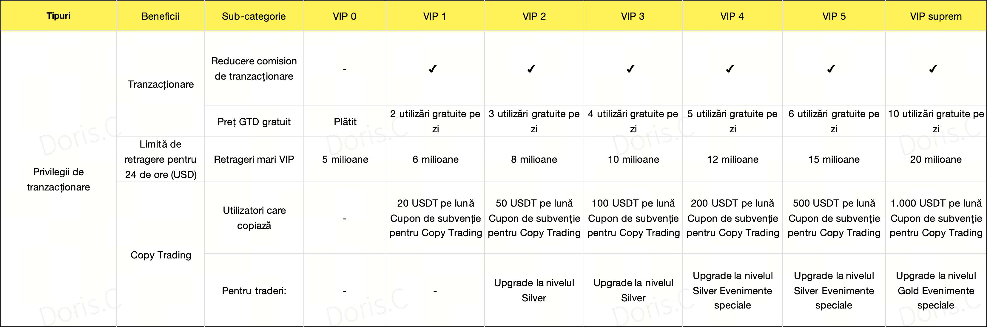 Limită de retragere pe 24 de ore (USD): pentru a răspunde nevoilor tale de flux de capital, limita de retragere pe 24 de ore (în USD) crește odată cu nivelul VIP, oferind o flexibilitate mai mare.