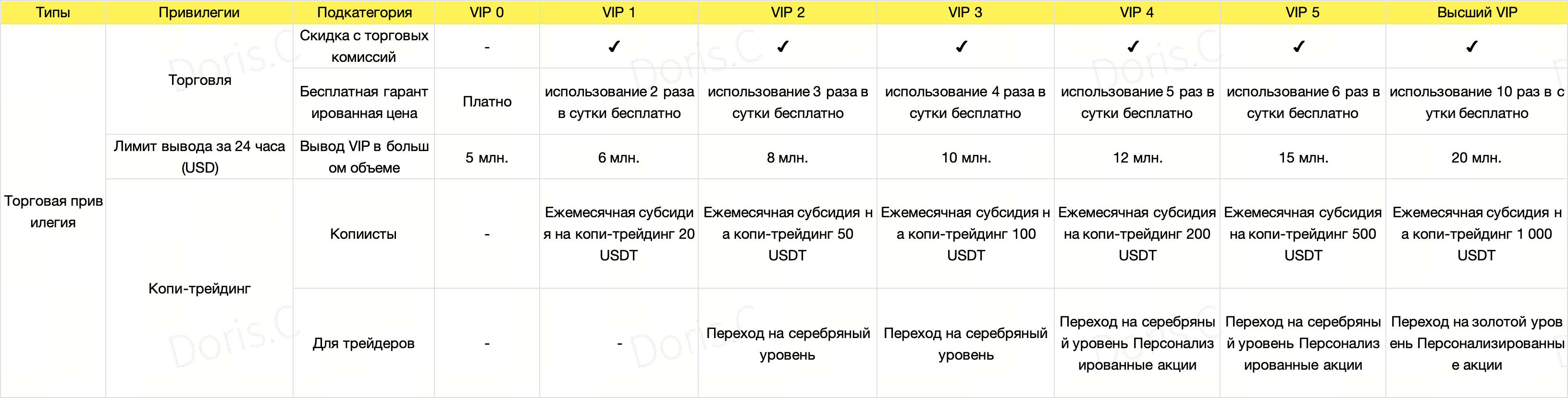 - Двойные торговые привилегии: VIP получают лимит бесплатного использования функции "Гарантированная цена". Чем выше уровень VIP, тем больше лимит. Кроме того, VIP-пользователи получают скидки с торговых комиссий, взимаемых за совершение сделок с фьючерсами, спот и в маржинальной торговле, благодаря чему стоимость актива для VIP становится выгоднее.