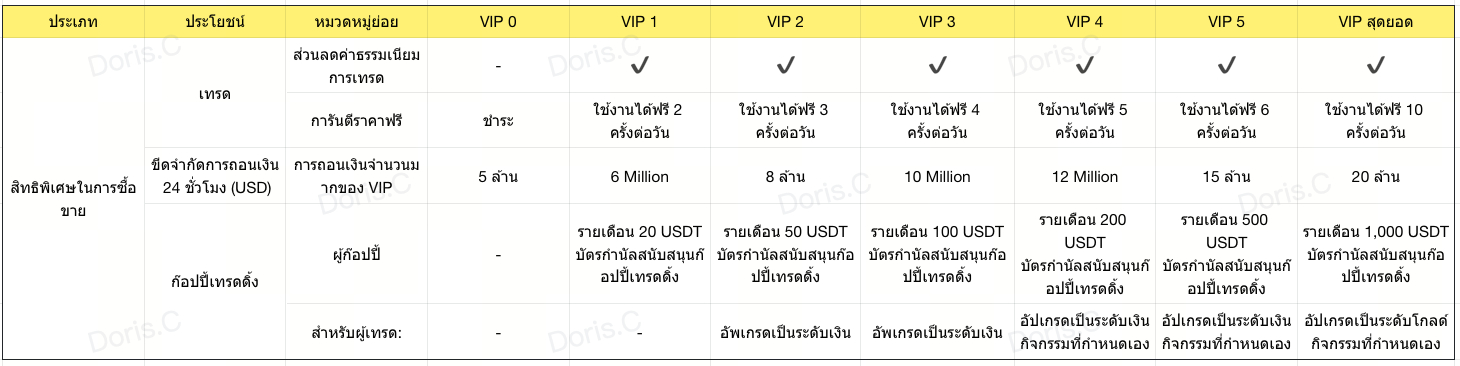 - สิทธิประโยชน์การเทรดแบบคู่: ผู้ใช้ VIP จะได้รับสิทธิ์ใช้งานฟีเจอร์ราคารับประกันฟรี โดยระดับที่สูงขึ้นจะมอบการใช้งานที่หลากหลายยิ่งขึ้น พวกเขายังจะได้รับส่วนลดค่าธรรมเนียมการเทรดสำหรับการซื้อขายฟิวเจอร์ส สปอต และมาร์จิ้น ทำให้ทุกการซื้อขายมีความได้เปรียบด้านต้นทุน
