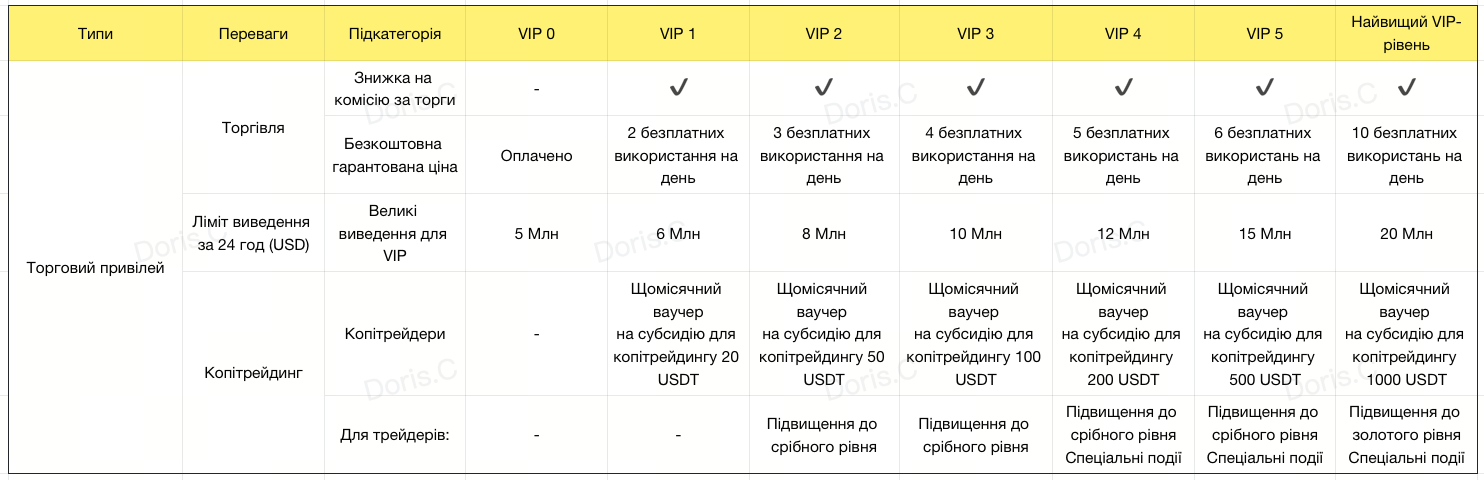 - 24-годинний ліміт на виведення (USD): щоб задовольнити ваші потреби в русі капіталу, ваш 24-годинний ліміт на виведення (в USD) збільшується разом із вашим VIP-рівнем, забезпечуючи більшу гнучкість.