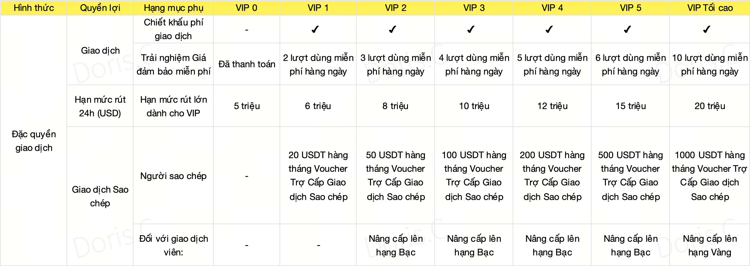 Hạn mức rút 24 giờ (USD): Để giúp bạn chủ động hơn trong việc sử dụng nguồn vốn, bạn sẽ được nâng hạn mức rút 24 giờ (tính bằng USD) theo cấp độ VIP.